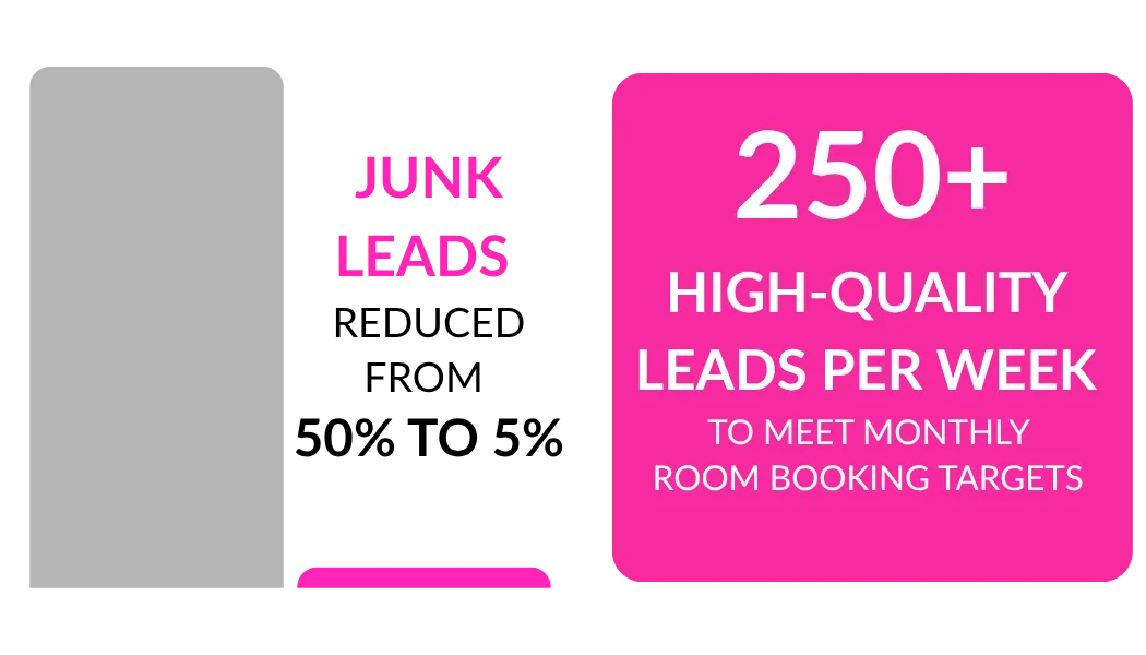 We delivered 250 high-quality leads weekly for this luxury resort, slashing junk leads from 50% to just 5%, and helped them meet room booking targets month on month.